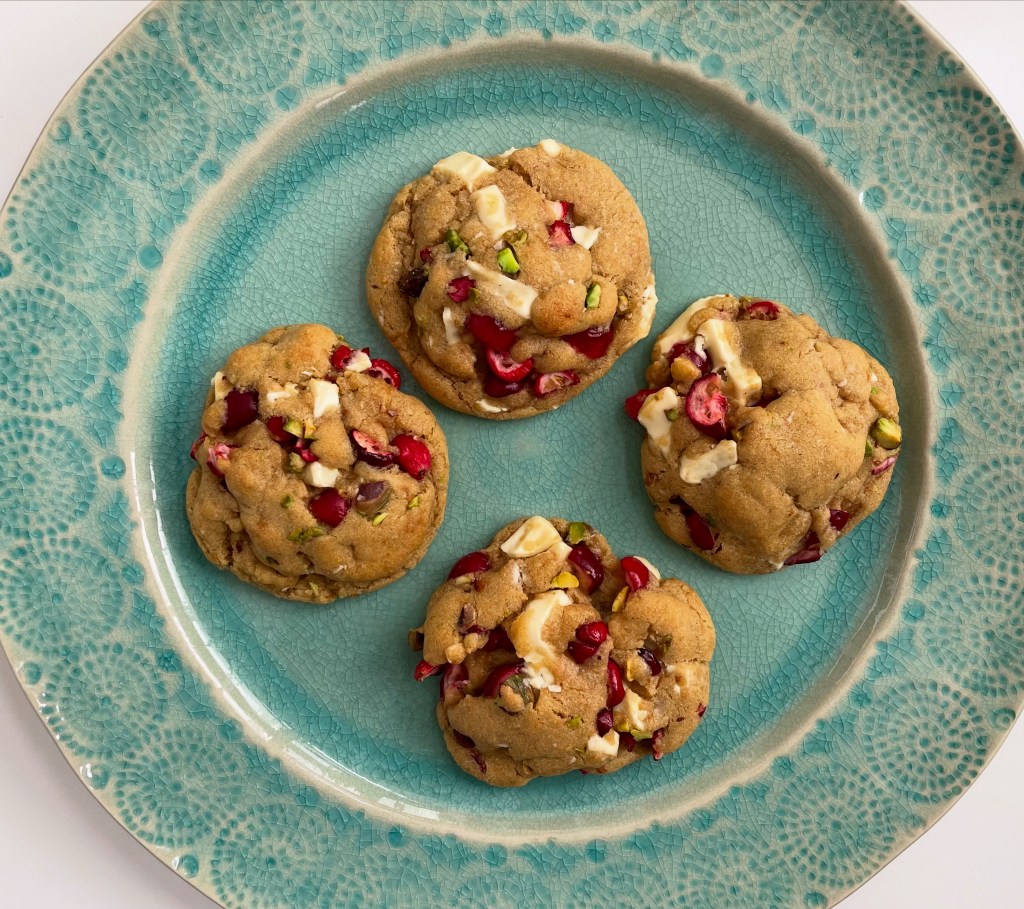 Refrigerate the dough for at least an hour. Preheat the oven to 350 degrees F and line a baking sheet with parchment paper. Remove the dough from the fridge and fold in the cranberries and pistachios. Drop 2-3 Tbsp of dough onto the prepared baking sheet, making sure to leave some space between each dough ball–they will spread.