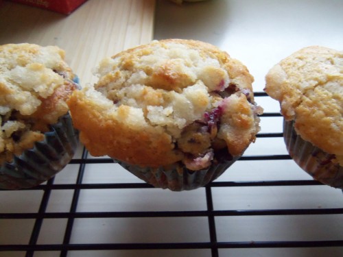 I found a Williams-Sonoma recipe for Blackberry Muffins, and the picture of the finished product was enough to make me pre-heat the oven. I tweaked the recipe a bit to fit my preferences (I don’t like nuts in my baked goods, and the recipe called for finely chopped pecans). I also didn’t have buttermilk, but I combined 2% milk and lemon juice for a quick fix.