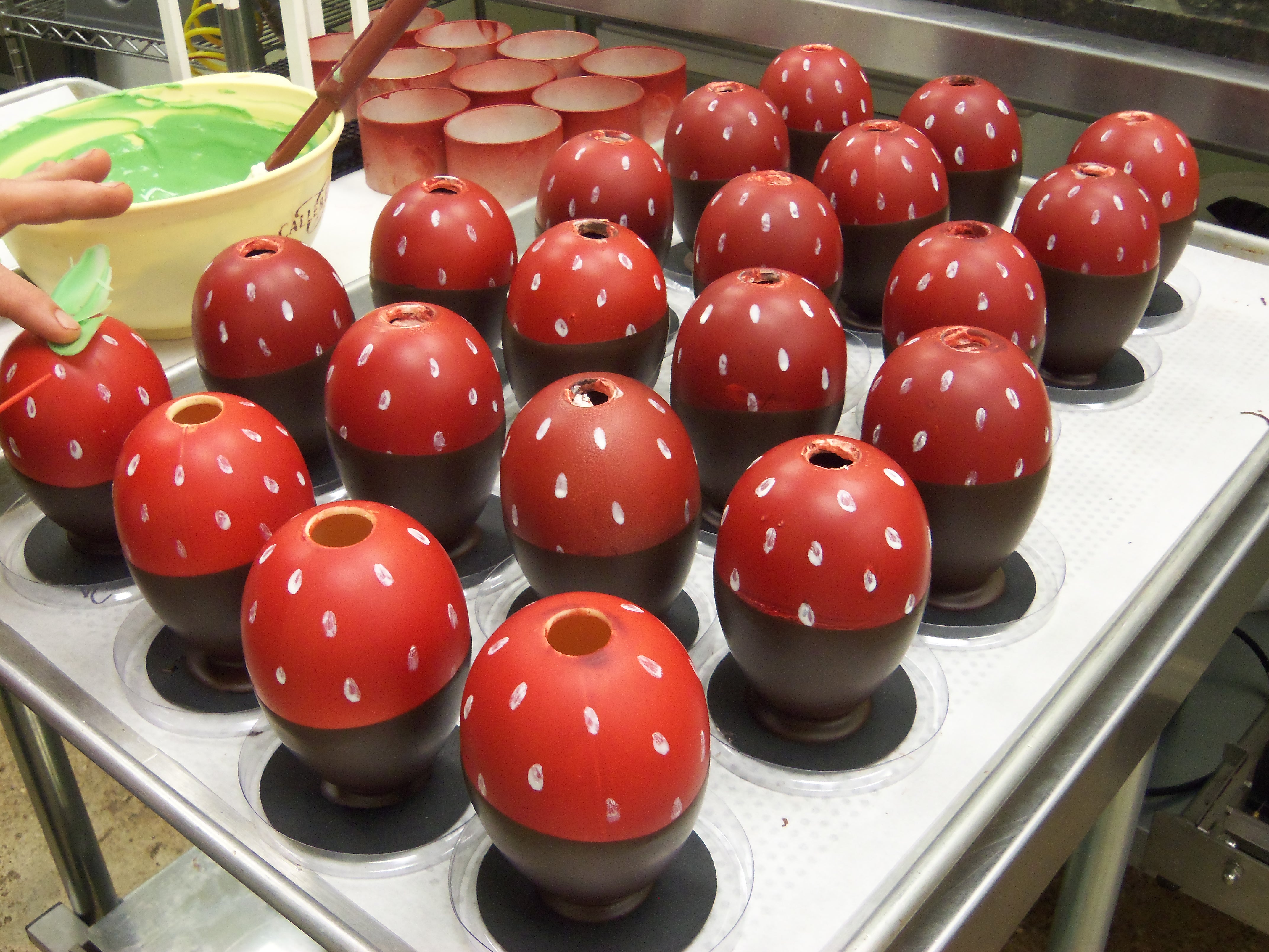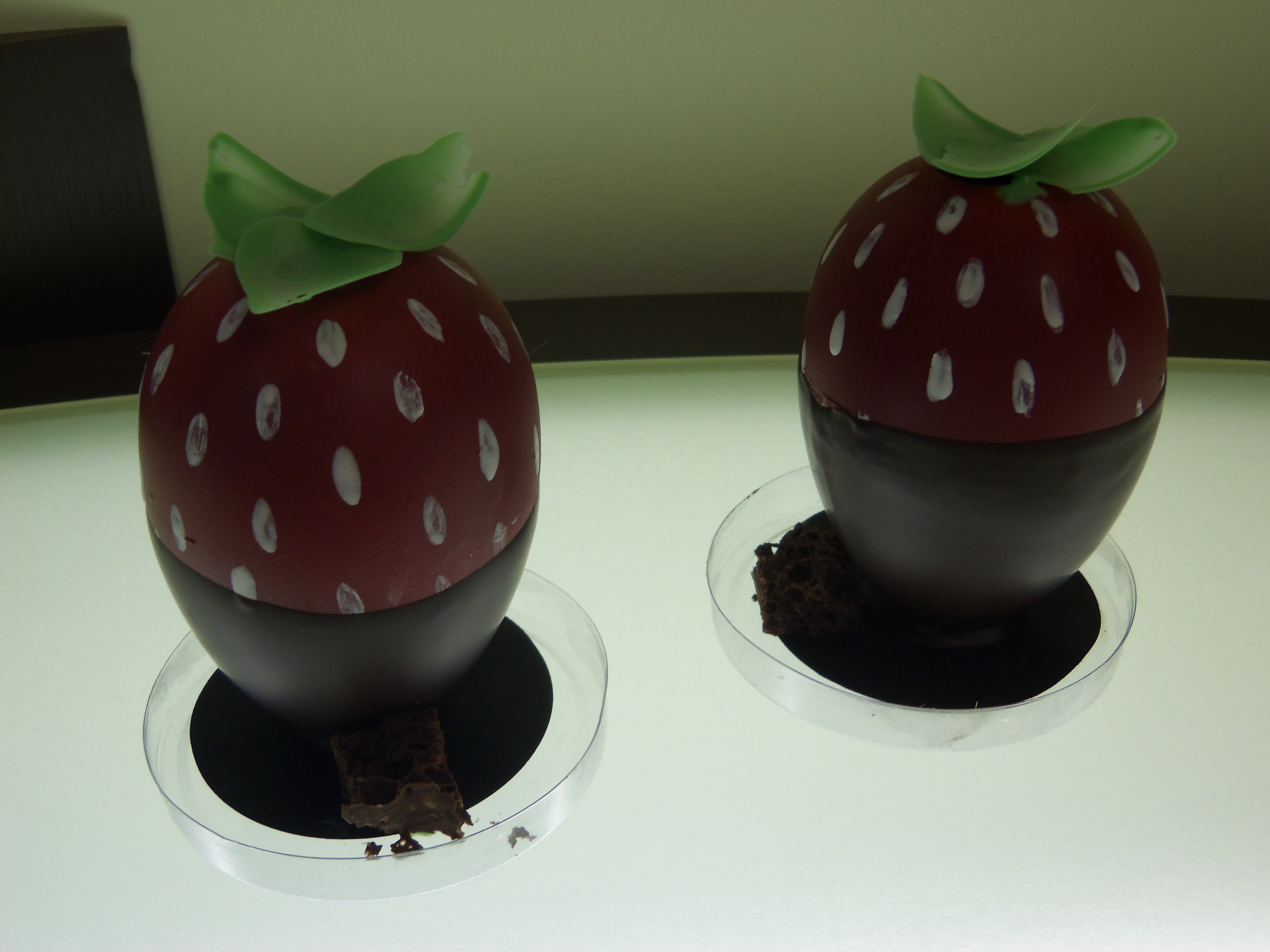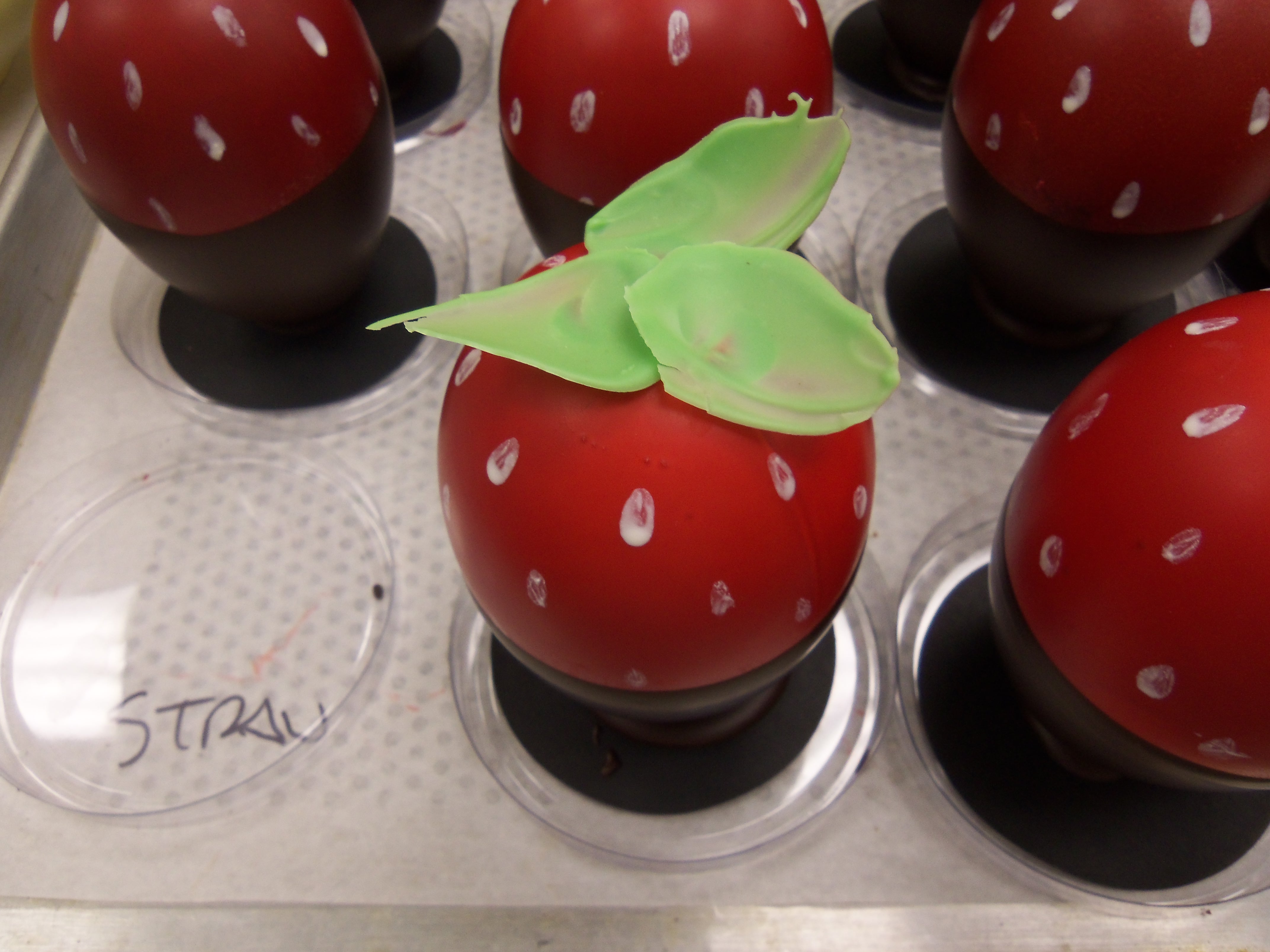 To create “Les Fraises,” he filled Easter egg molds with Dark Chocolate, and then air-brushed the eggs with white and red cocoa butter.  Each egg was filled with marshmallow mixed with strawberry purée (from real, in-season berries), and topped with delicately constructed white chocolate leaves that were colored with green cocoa butter.