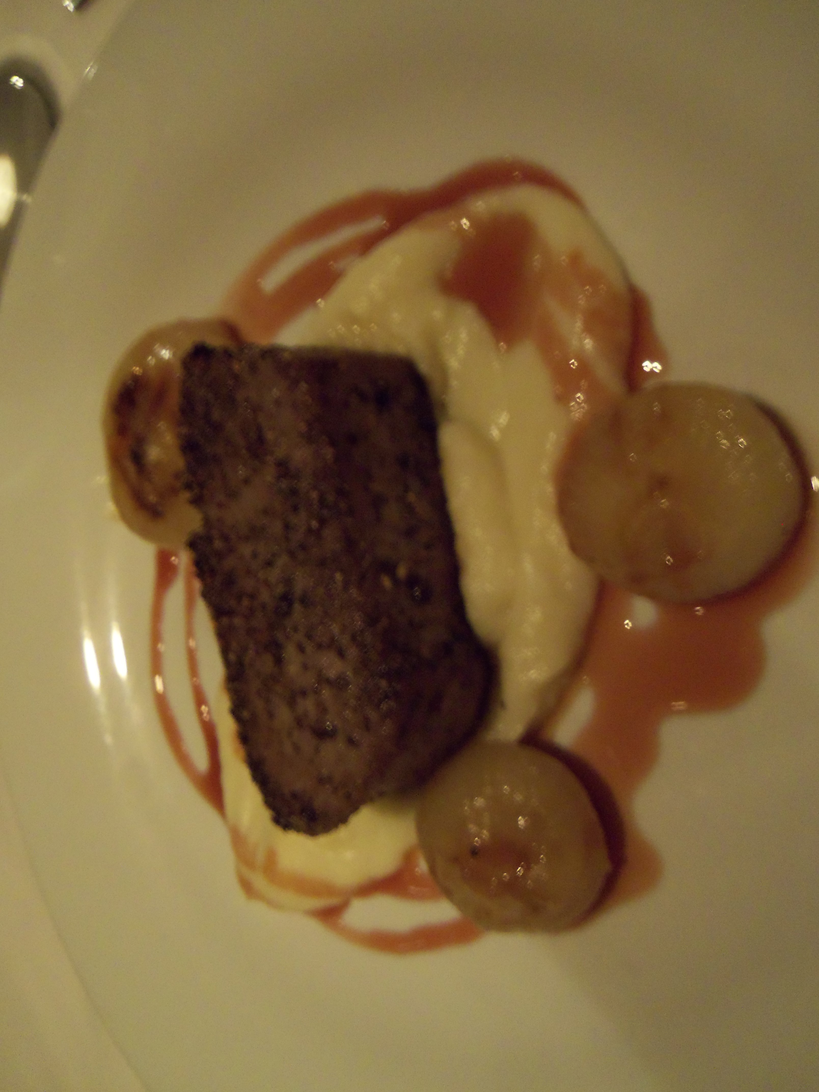 I was only in Nashville for two days, so I decided to re-visit some old favorites. For dinner on Saturday night, we went to F. Scott’s, and indulged in a three-course meal. I chose the Sweet Potato Soup for my first course, and then we both ordered Roasted Yellowfin Tuna for our main dish. The fish was served on top off a slightly sweet parsnip puree (perhaps this was my first-ever taste of parsnips?), and some caramelized Cippolini onions.