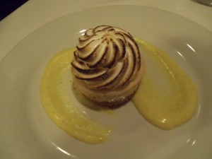 Which is why I’m glad that we chose to order dessert. I can honestly say (without any hesitation or fingers crossed) that this is the best dessert I’ve eaten since returning from France. We decided on the Peanut Butter Tart with crushed pretzel crust, topped with banana marshmallow mousse and garnished with vanilla Creme Anglaise. The light, airy texture of the mousse complimented the peanut butter’s creamy texture and salty taste perfectly. Not to mention the sugared pretzel crust…The three ingredients together made for dessert perfection.