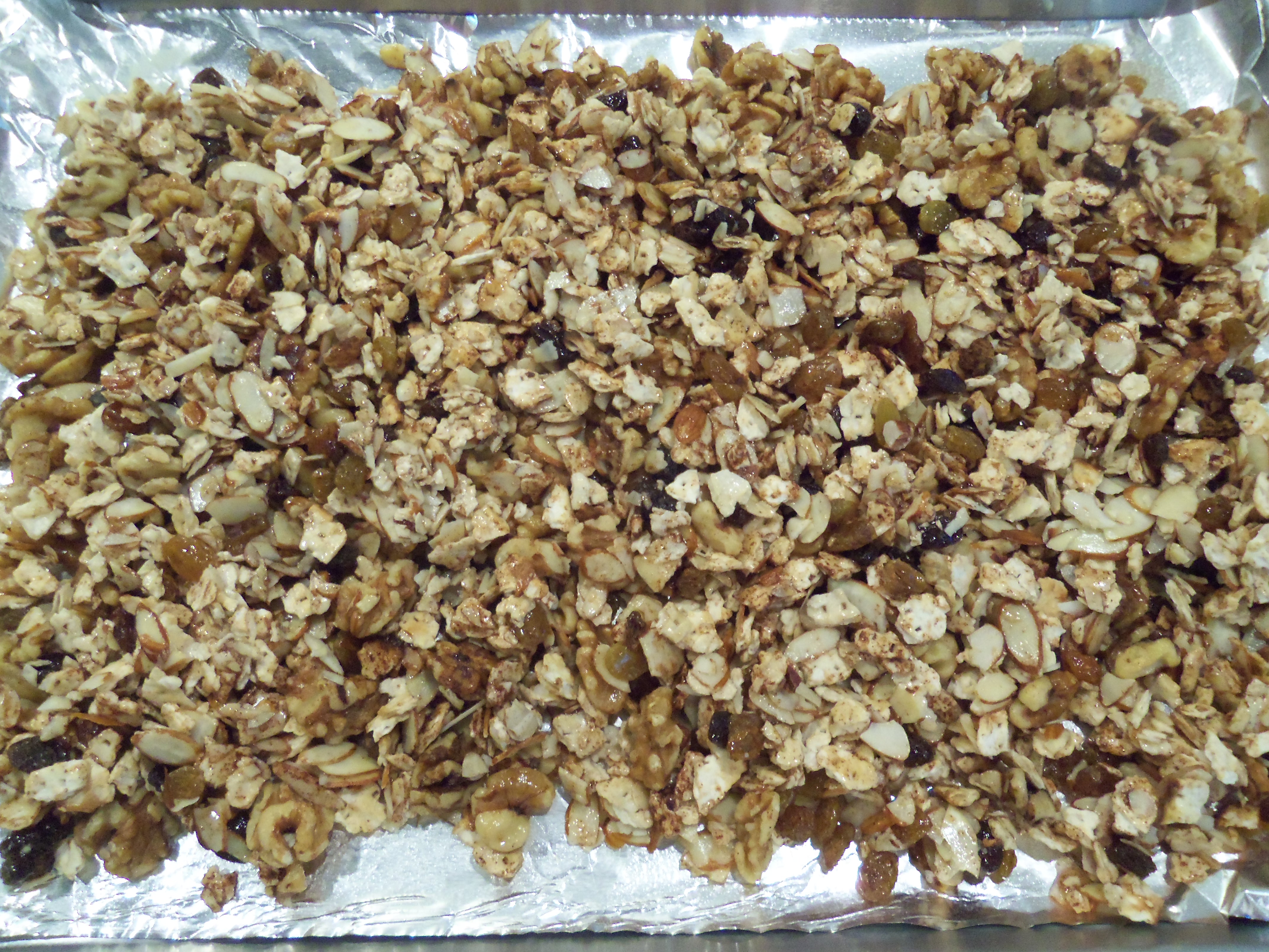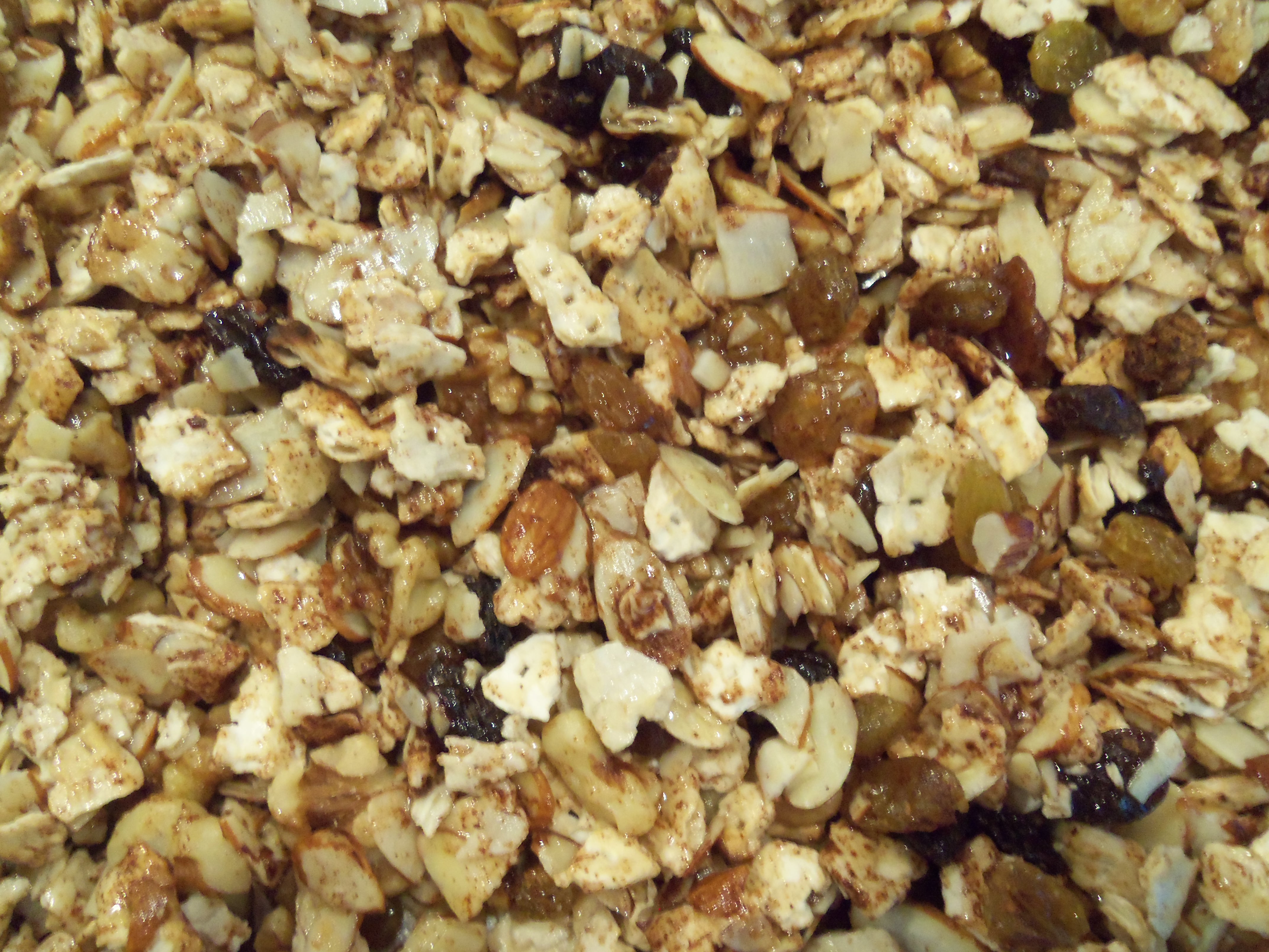 The granola is, in a word, delicious. I would highly recommend it to anyone who is looking for a quick and easy Passover breakfast. The raisins are plump and juicy, the almonds give the cereal a nice, toasted flavor, and the salt contrasts nicely with the honey and cinnamon. I put in a little more salt than the recipe called for (because I substituted oil for margarine), and you can use less to your taste.