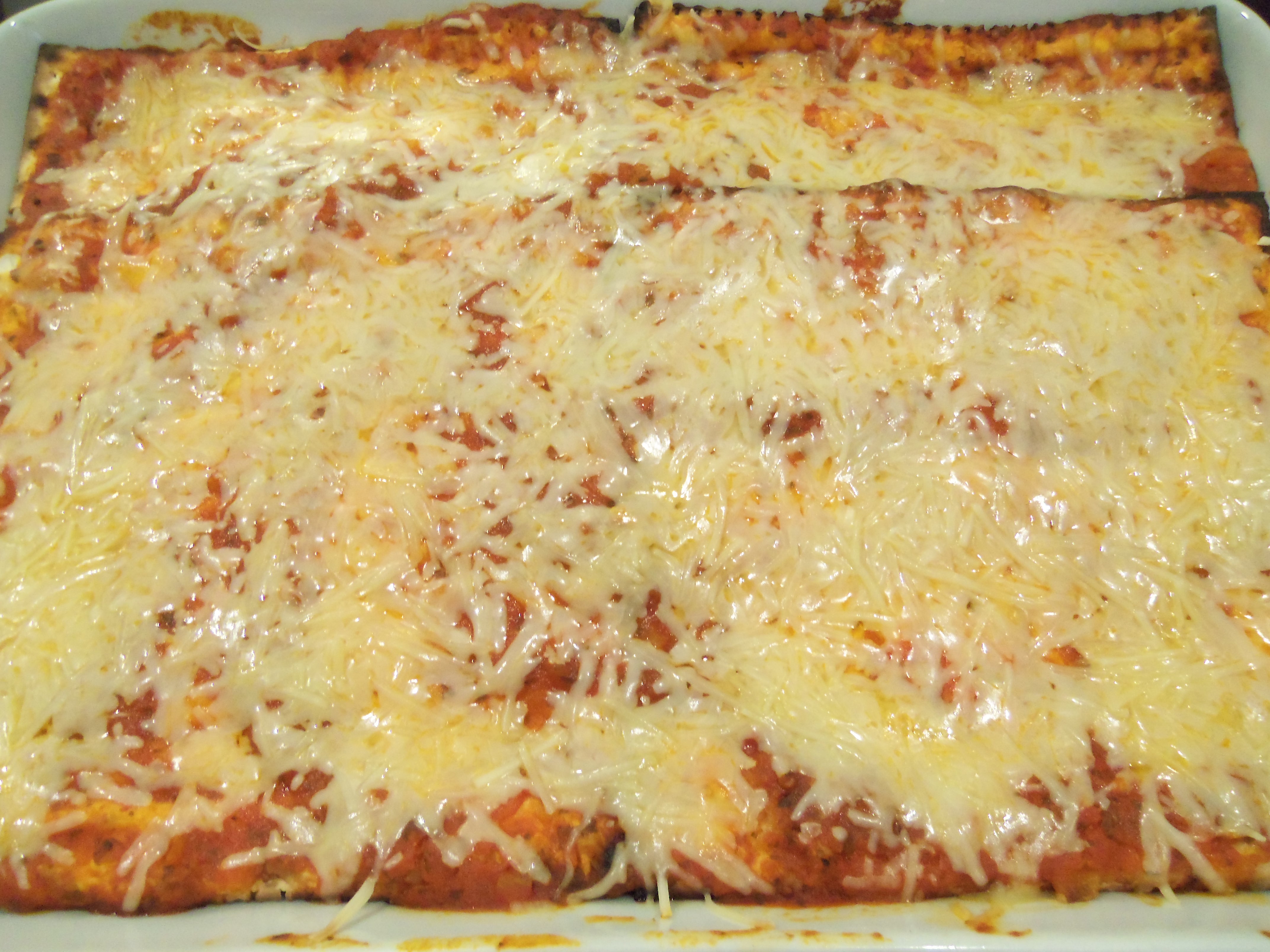 This year, I sprinkled fresh spinach leaves on top of the cheese/sauce layers, and ad-libbed my own recipe from two I found online. Really, you don’t even need an exact recipe for this lasagna…You just break up Matzah, pour sauce and cheese over it, and continue layering until you get to the top of the casserole dish.