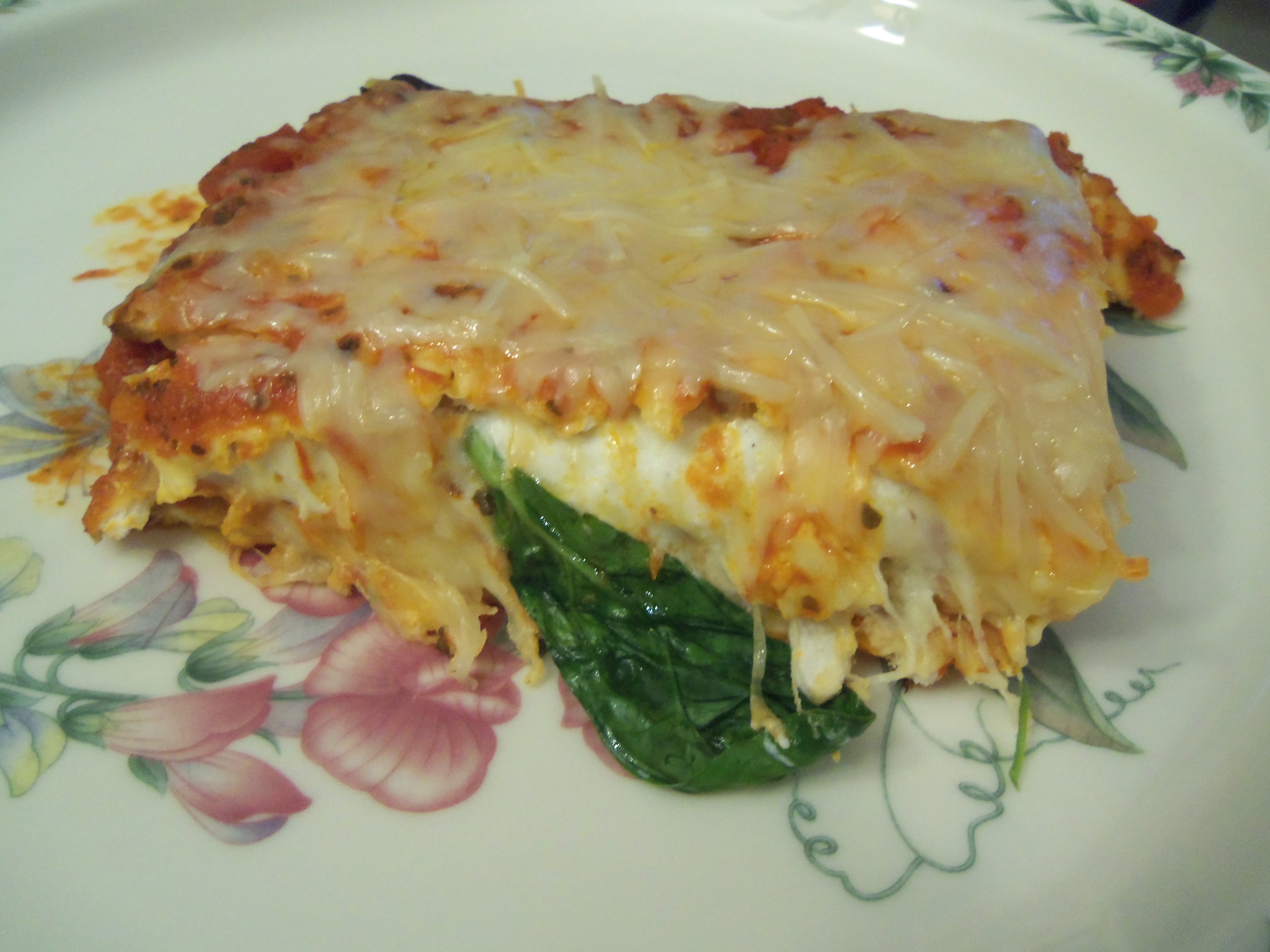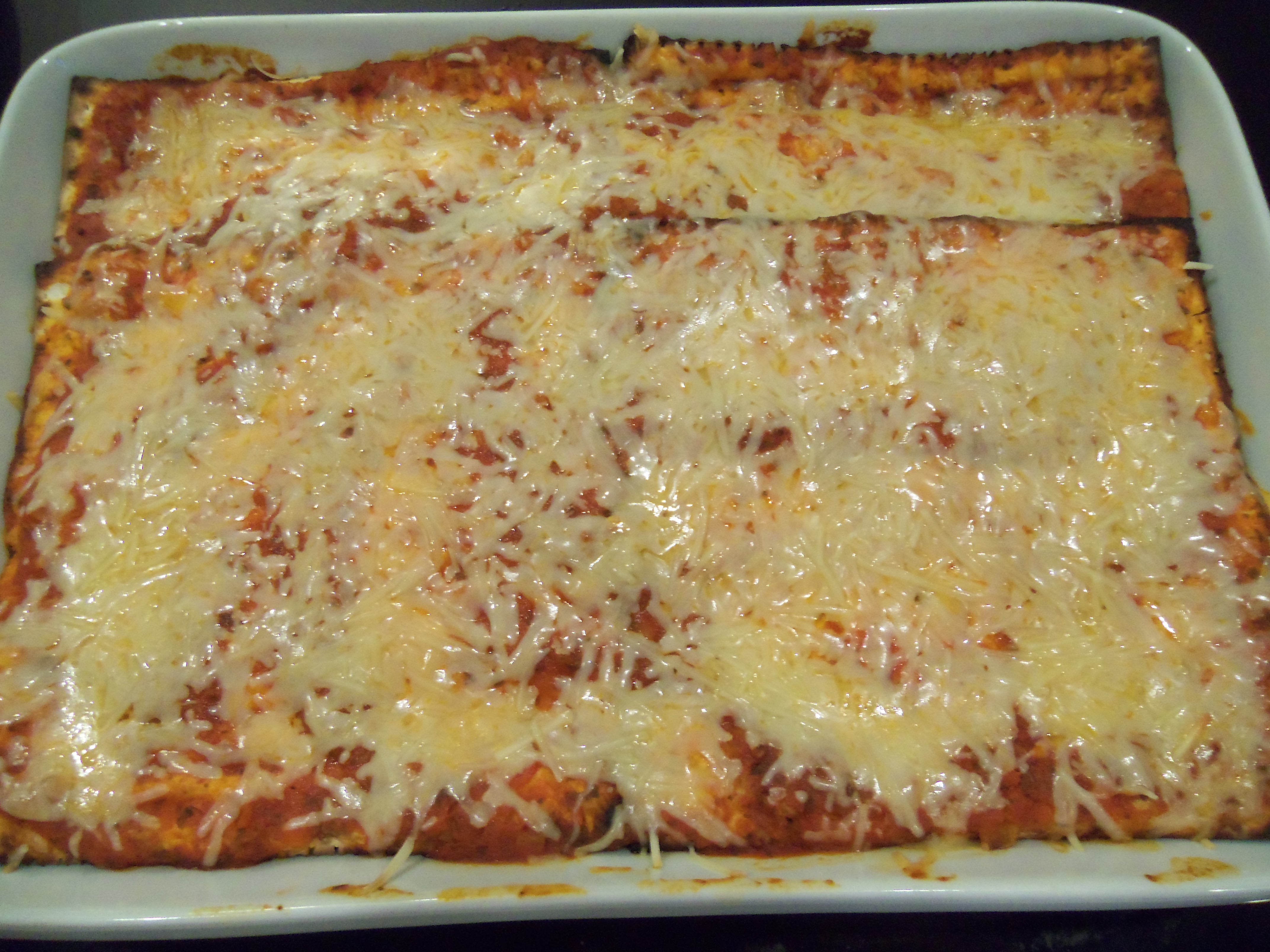 It’s quick, easy, and for a “faux” food, it tastes as good as the real thing. I love the fluffy Ricotta mixed with Mozzarella, the rich tomato sauce and the sprinkling of Parmesan on top.