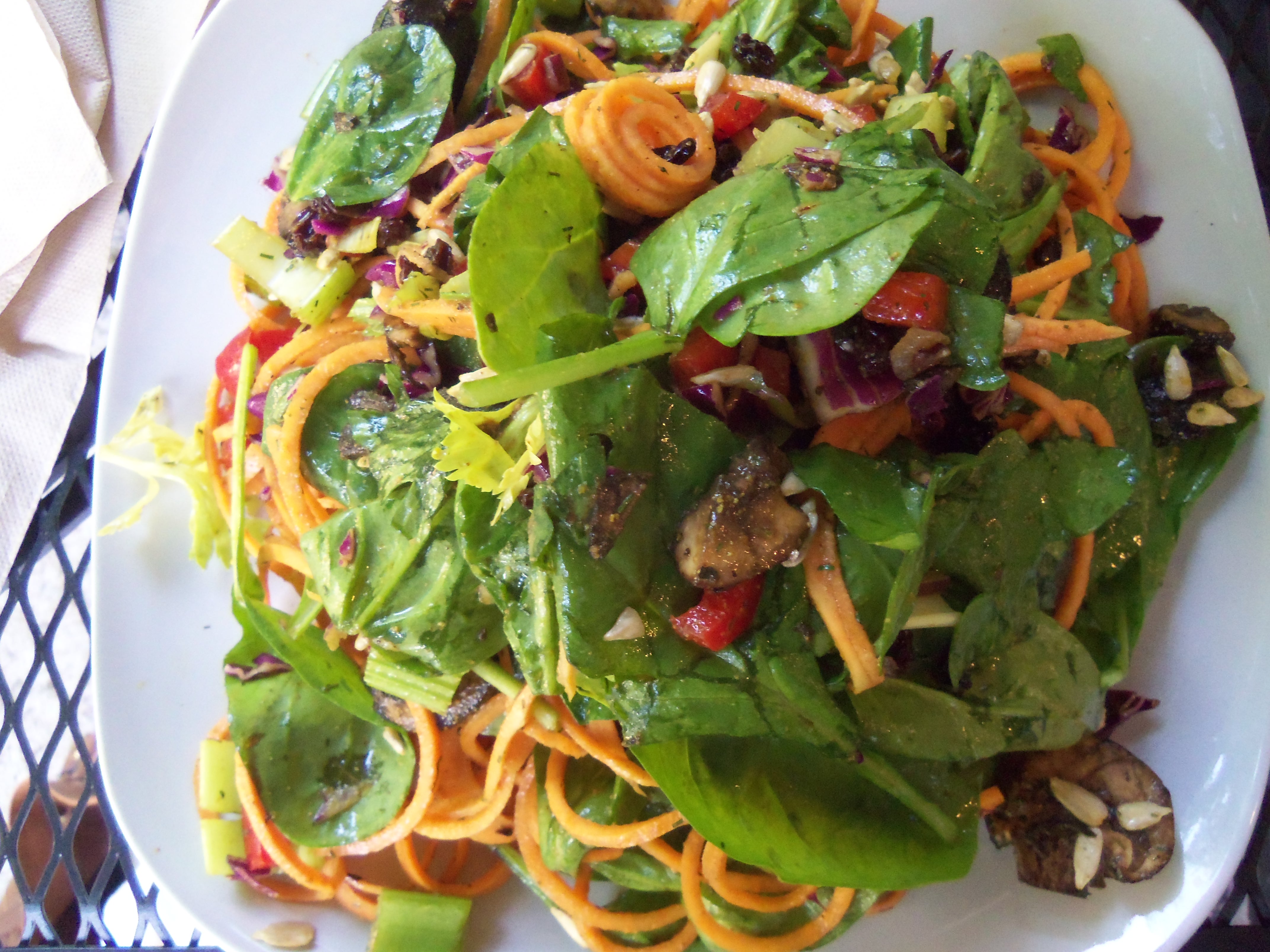 I ordered the Sweet Potato Pasta, which was sweet potato “noodles” (i.e., long, skinny pieces of peeled sweet potato), crunchy celery, green onions, red onions, sunflower seeds, tiny, sweet currants, marinated mushrooms, and spinach. All the ingredients were tossed with Asian-flavored spices and herbs, and the whole dish resembled one big salad.