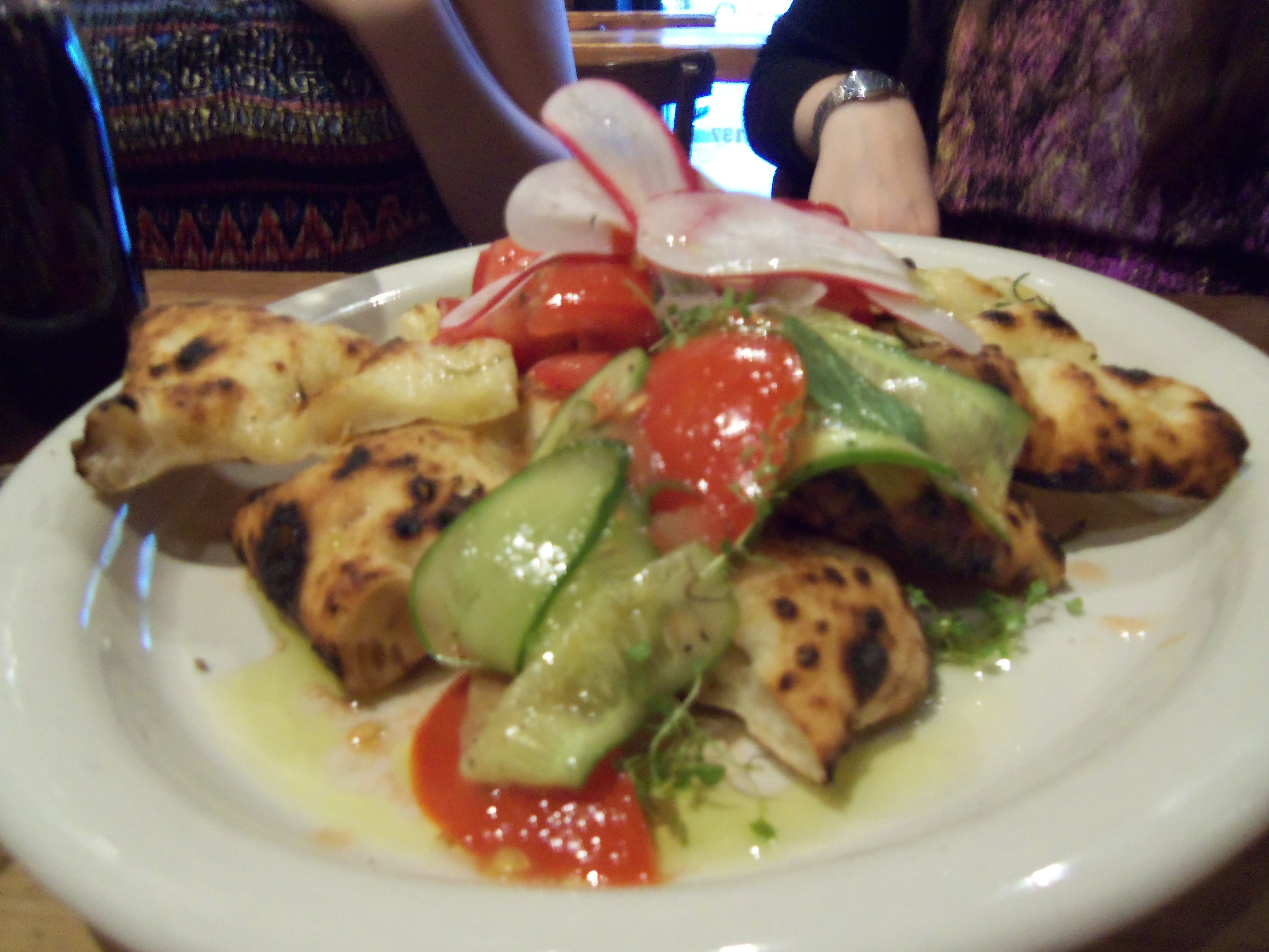 Because it was my friend’s birthday, the manager brought over a free appetizer. It consisted of warm, soft pieces of pizza dough with a medley of fresh vegetables on top: English cucumbers, tomatoes, long, ribbon-thin slices of zucchini, and radishes. All the ingredients were fresh and crisp, and topped with a light sprinkling of olive oil.