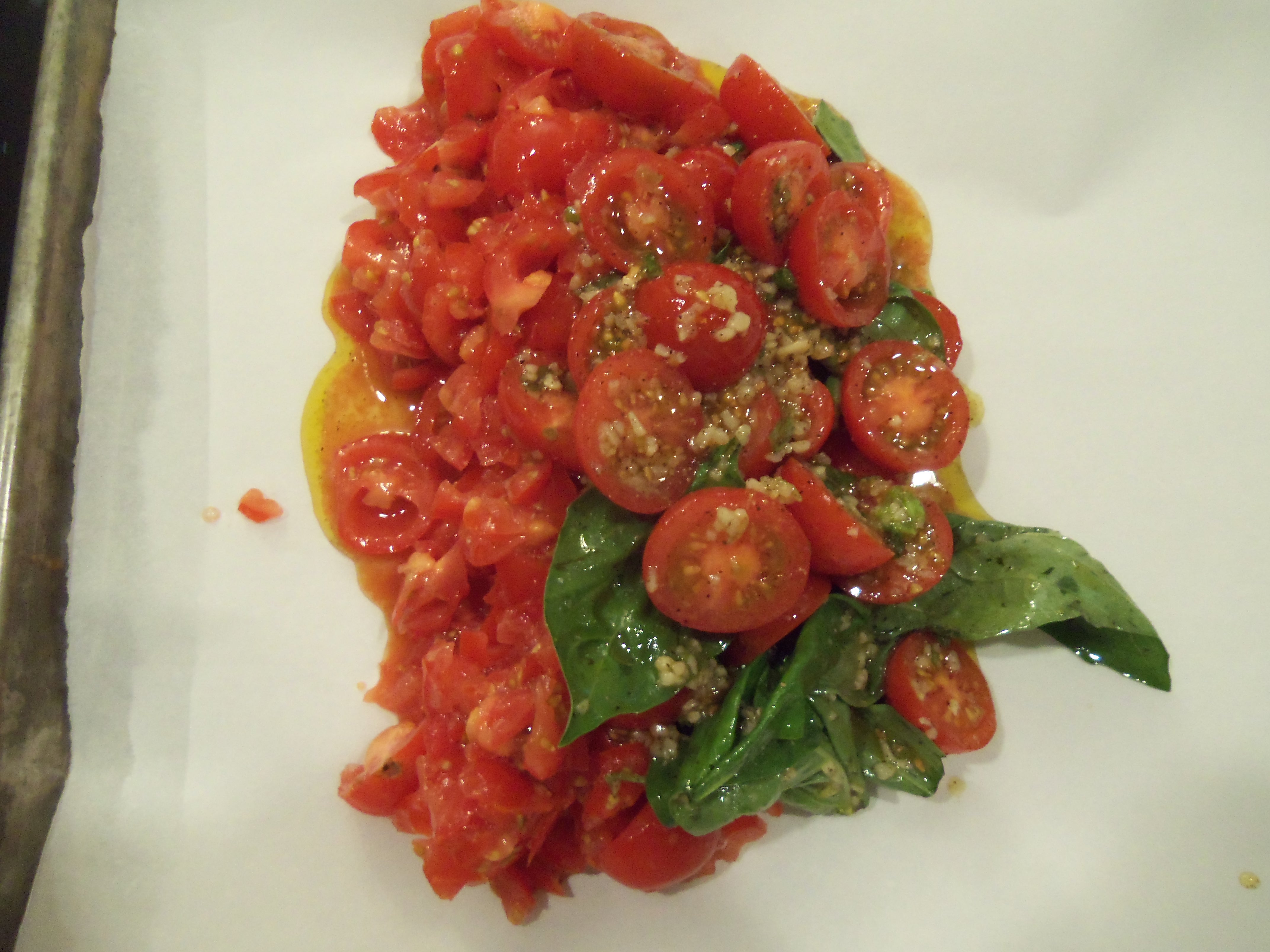 When I was reading the recipe, I somehow didn’t notice the half-page sidebar telling me to turn to page 109 for paper folding techniques. After searching for YouTube videos with step-by-step paper basket-making processes, I gave up. I placed the tomato-basil mixture on one half of the paper, and folded the two 12″ sides together.