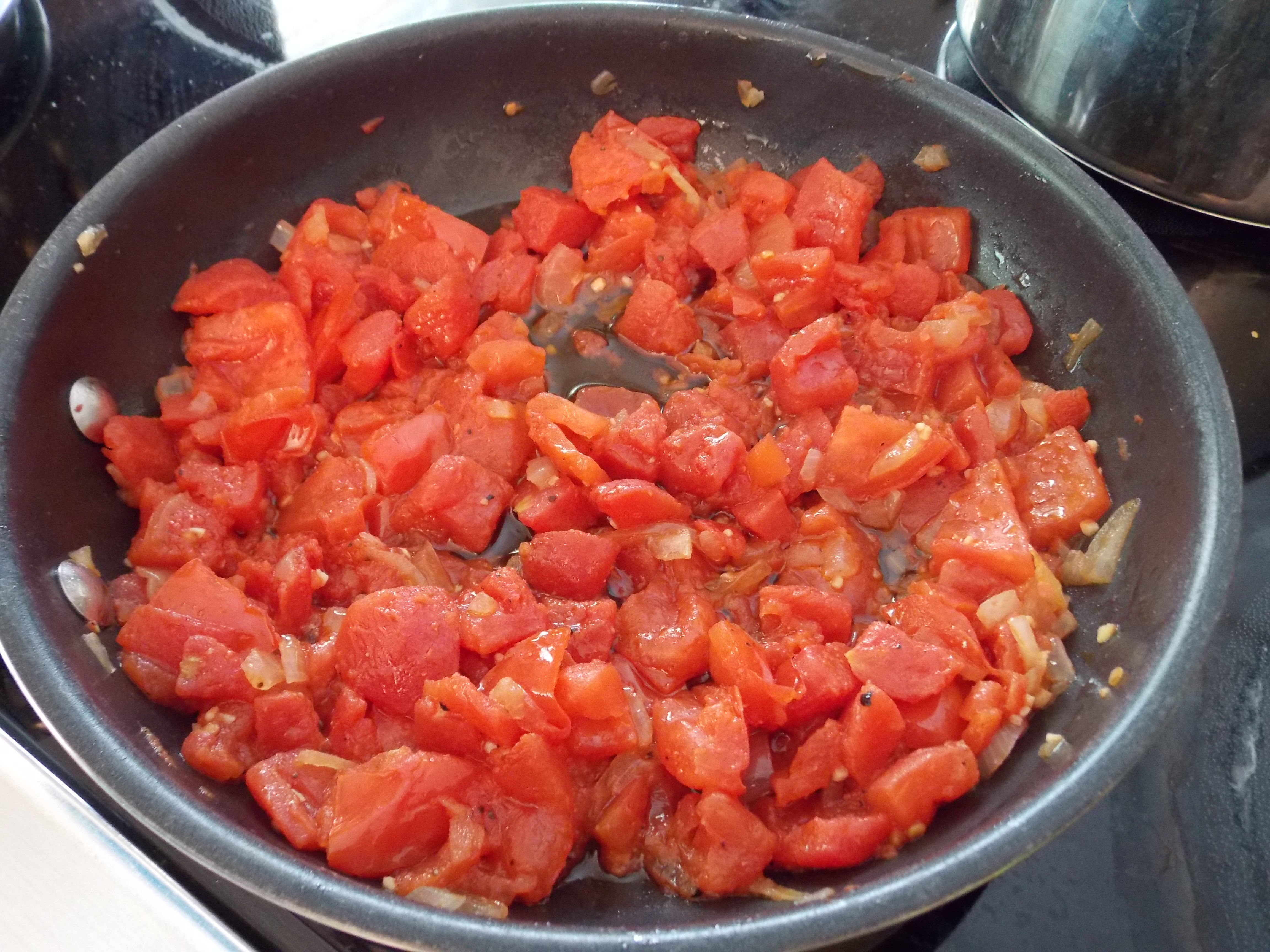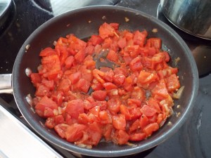 Luckily I had a big, overripe tomato on hand (I buy most of my produce now from a Farmer who lives down the street), and a can of diced tomatoes. I also found half a white onion in the fridge and some minced garlic. This time around, we had all the right ingredients…the question was, how would the sauce turn out?