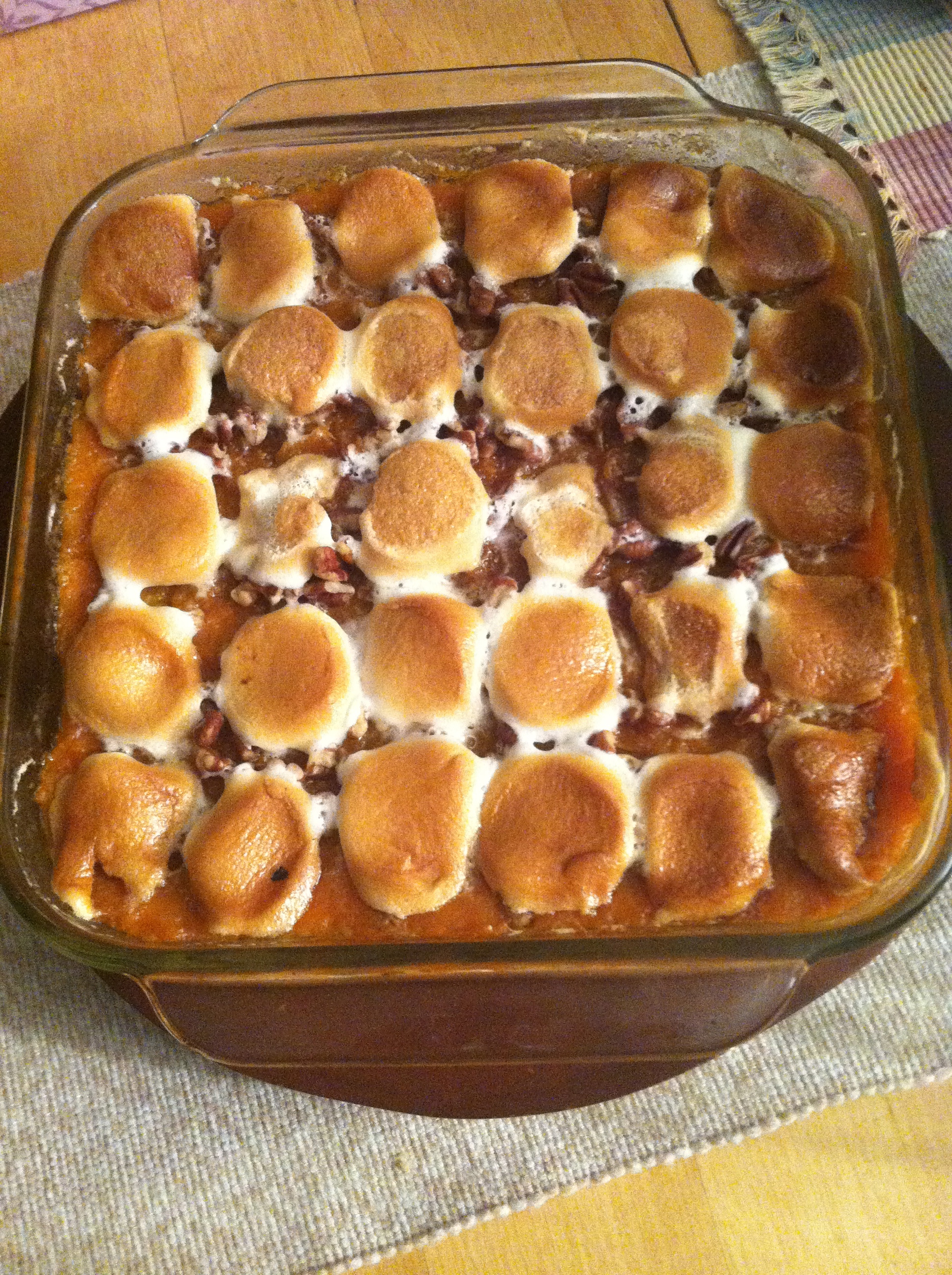 We planned out the menu ahead of time, and decided to make a mixed greens salad with pears and Gorgonzola, dinner rolls, green bean casserole with fried onions, and two desserts. We agreed on most of the dishes, except my favorite one: sweet potato casserole with marshmallows. To me, it’s not Thanksgiving without sugary, mashed sweet potatoes and crispy brown marshmallows; I can’t picture the holiday without them. But Namita had never tried the casserole, and thought the marshmallows might be overkill. Thankfully, I convinced her otherwise. We added in chopped pecans (something my mom never did), and I liked the crunchy texture.