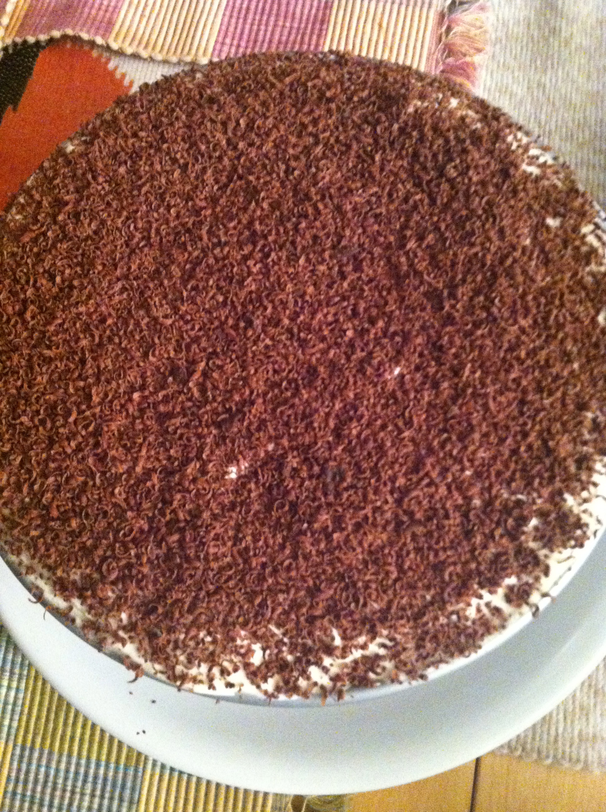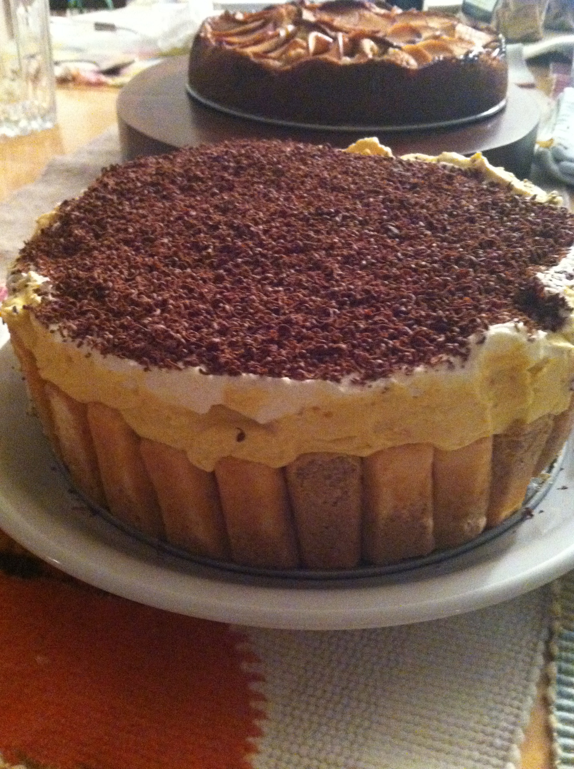 I wanted there to be something with pumpkin on the table, and Namita wanted to make tiramisu–so we compromised. We whipped the cream with a hand mixer, and broke all the ladyfingers in half to line the pan. We folded the pumpkin into the cream, assembled the layers, and put dark chocolate shavings on top. Then, I read the last part of the directions: “let the cake set for 8-12 hours.” Everyone was supposed to arrive in 45 minutes.