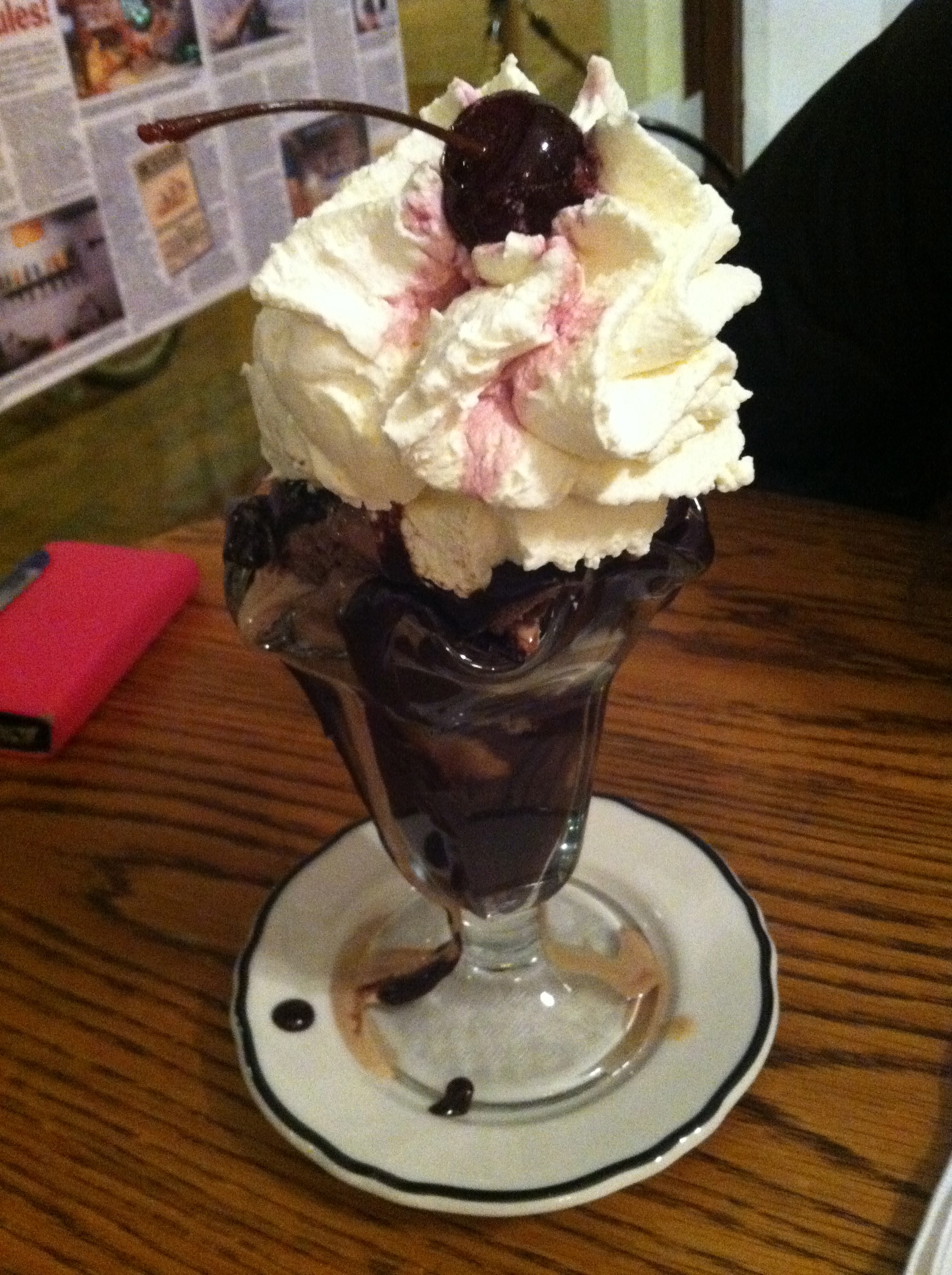 We went to Franklin Fountain, an old-fashioned soda and ice cream shop. The waiters dress in white aprons and hats, and make ice cream sundaes or sodas on the counter in front of you. We ordered a hot fudge sundae with coffee and chocolate ice cream. It was served in a traditional parlor glass with whipped cream and a real cherry on top. We scraped every last bit of fudge out of the glass.