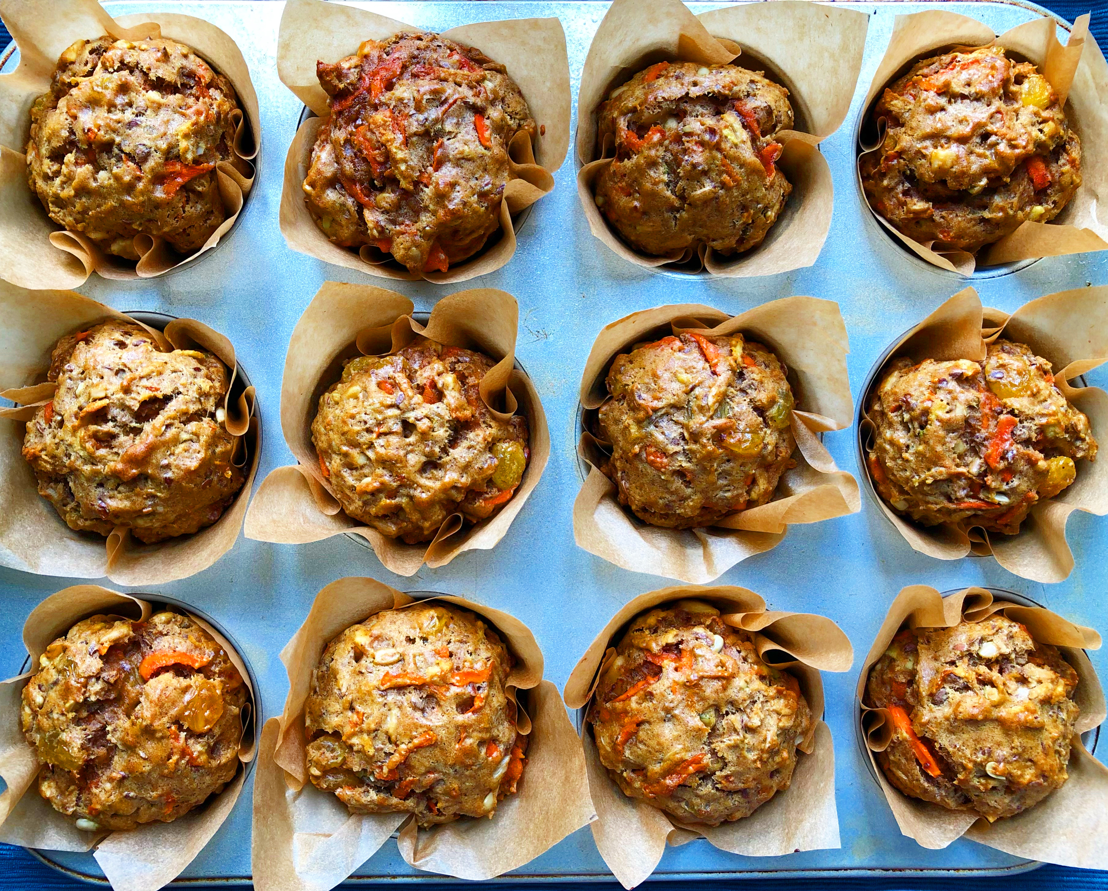 Cue: These carrot cake muffins. They’re moist (had to use that word, even though I hate it); full of good stuff like flax seeds, walnuts, shredded apple and carrot; and they have plenty of fall spices like cinnamon and ginger. Also, they have lots of brown sugar and golden raisins, so you still get sweetness even though there’s a healthy dose of savory ingredients.