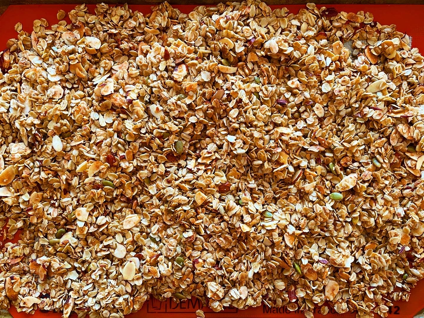 You might be tempted to skip the raking step. I know I was. But commit to the rake; it will yield granola that’s more evenly done, slightly caramelized, and crispy. No one wants sad granola with undone or overdone pieces.